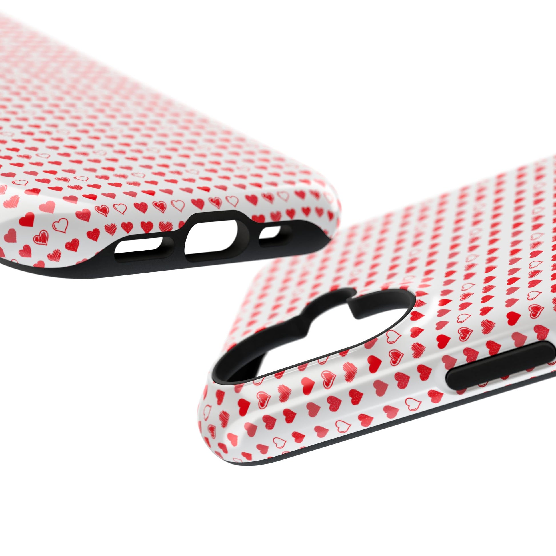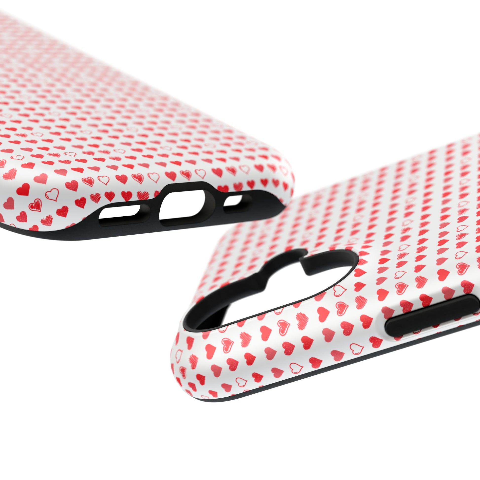 A slim, impact-resistant phone case that brings a playful, hearts-on-repeat pattern to your everyday carry. The dual-layer construction — a rigid polycarbonate shell with a removable TPU inner liner — keeps your phone safe from everyday bumps and scratches while maintaining a lightweight feel. The full-wrap print keeps the tiny red hearts visible around edges and corners, and you can choose a glossy or matte finish to match your style. Colors are bright and detailed thanks to high-resolution printing, and the case supports wireless charging so it slips into your routine without fuss. Comfortable edges and precise cutouts keep buttons and camera access effortless, while the subtle texture of the print gives this case a handcrafted, cozy look that complements casual outfits or layered accessories.